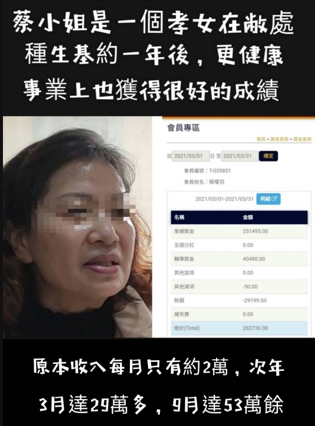 住在桃園八德的蔡姐是一個孝女,工作很努力帶人非常寬厚大方,從事業務工作早出晚歸,工作很辛苦但是每個月收入只有兩萬元,慷慨的個性根本入不敷出。而且常常生病,氣色都不好。2020年由柏修老師幫忙種生基,蔡姐第二年三月的單月收入就達到30萬元,9月份的單月收入更達到53萬元。蔡姐為人處事與工作精神已獲得朋友和客戶們的肯定,蔡姐健康感覺前後判若兩人。2025年8月份,蔡姐是保養品公司銷售冠軍第一名,光兩週的活動蔡姐的收入就超過1百萬元。